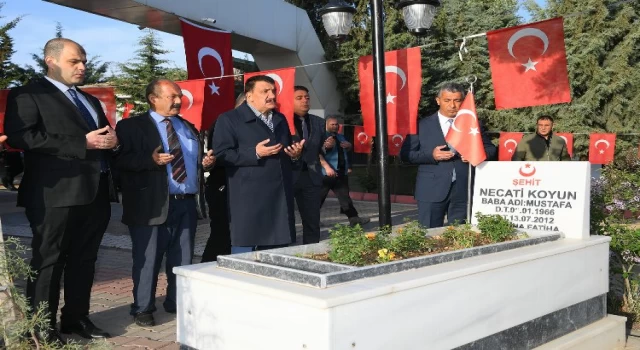 MALATYA İGFA- Bayram Namazını Şehir Mezarlığı Camii’nde kılan Malatya Büyükşehir Belediye Başkanı Selahattin Gürkan, namaz sonrasında da Vali Aydın Baruş ve İl Jandarma Komutanı Ercan Altın ile birlikte Şehitlik ziyaretinde bulundu. Şehitlikte ziyarette bulunan şehit ailelerinin Ramazan Bayramlarını da tebrik etti.