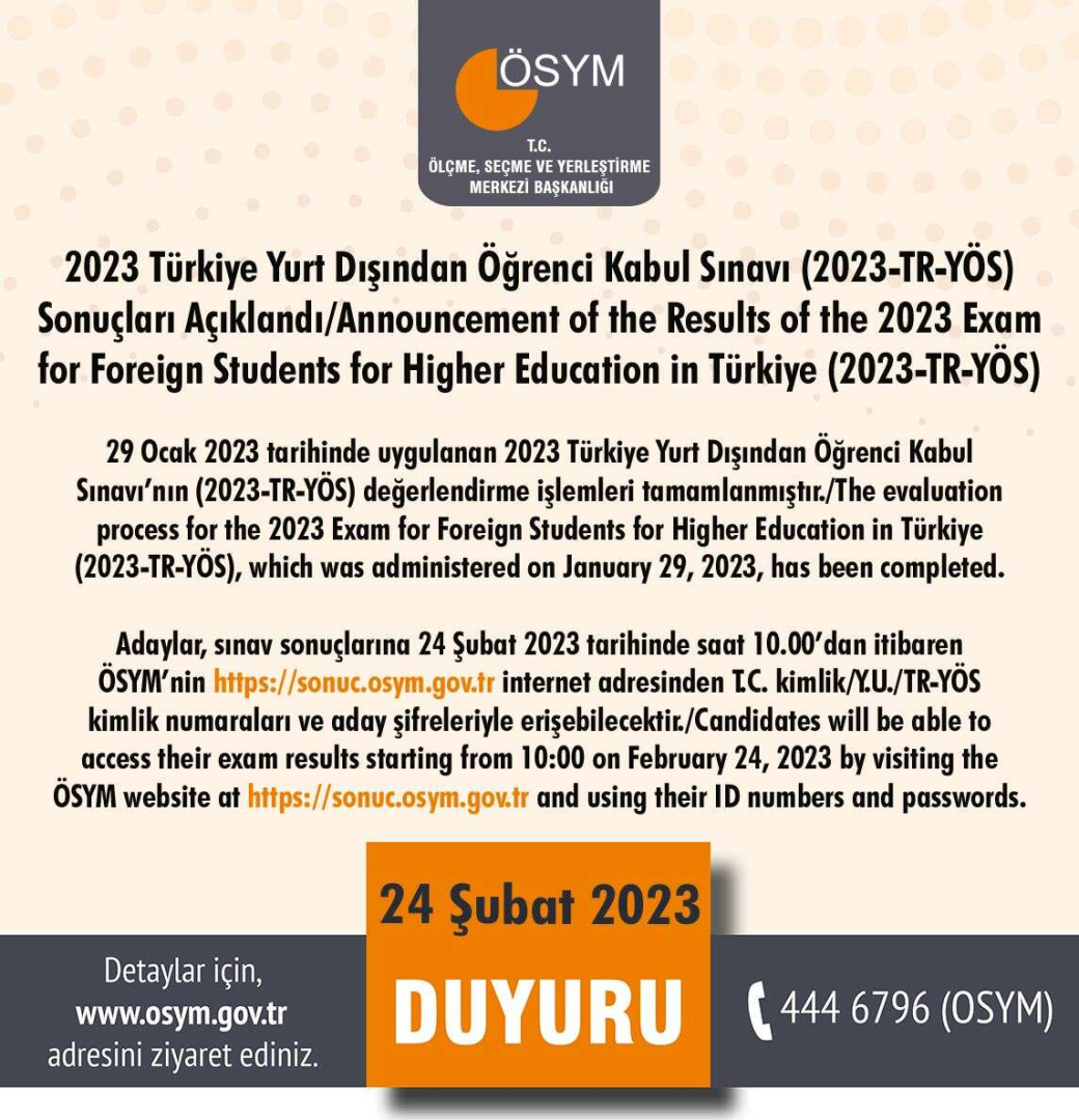ÖSYM'nin internet sitesinde yer alan duyuruya göre, 2023-TR-YÖS değerlendirme işlemlerinin tamamlandığı açıklandı.
