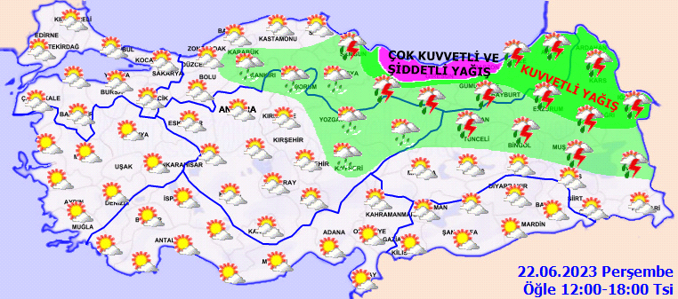 KUVVETLİ GÖK GÜRÜLTÜLÜ SAĞANAK YAĞIŞ UYARISI: Yağışların; Orta ve Doğu Karadeniz kıyıları, Doğu Anadolu’nun kuzeydoğusu ile Artvin çevrelerinde yerel kuvvetli (21-50 kg/m2); Ordu, Giresun, Trabzon ve Rize çevrelerinde çok kuvvetli ve şiddetli (51-100 kg/m2) olması beklendiğinden sel, su baskını, yıldırım, yerel dolu yağışı, heyelan, kuvvetli rüzgar ve ulaşımda aksamalar gibi olumsuzluklara karşı dikkatli ve tedbirli olunması gerekmektedir.