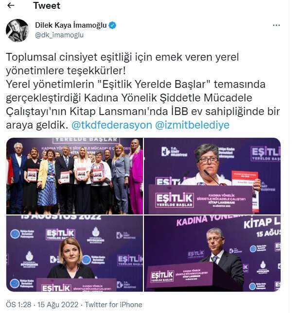 İmamoğlu, İzmit Belediyesi ve Türkiye Kadın Dernekleri Federasyonunu etiketlediği paylaşımında, “Toplumsal cinsiyet eşitliği için emek veren yerel yönetimlere teşekkürler! Yerel yönetimlerin "Eşitlik Yerelde Başlar" temasında gerçekleştirdiği Kadına Yönelik Şiddetle Mücadele Çalıştayı’nın Kitap Lansmanı’nda İBB ev sahipliğinde bir araya geldik” ifadelerini kullandı.