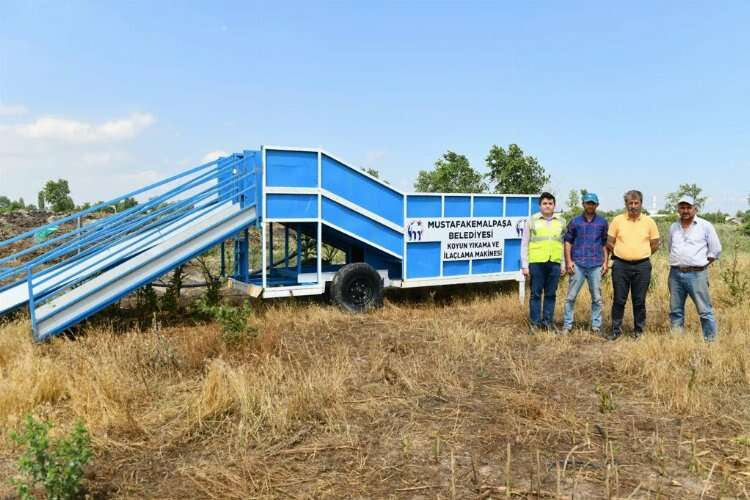 Kurban bayramının yaklaşması ile birlikte bit, pire, parazit, uyuz hastalığın küçükbaş hayvanlardan atılması, et veriminin arttırılması adına Bursa'da Mustafakemalpaşa Belediyesi Destek Hizmetleri Müdürlüğü personellerinin, kendi atölyelerinde ürettiği, koyun yıkama makinesi bu yılda hizmette.