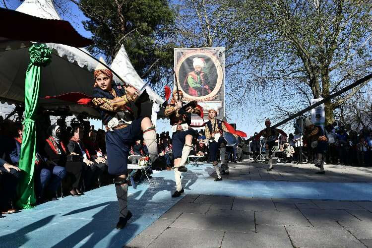 Tophane Meydanı’nda gerçekleştirilen şenliklerin açılış töreni, Tarihi Bursa Mehter Takımı ve Tahtakıran Kılıç Kalkan Ekibi’nin gösterileri ile başladı.