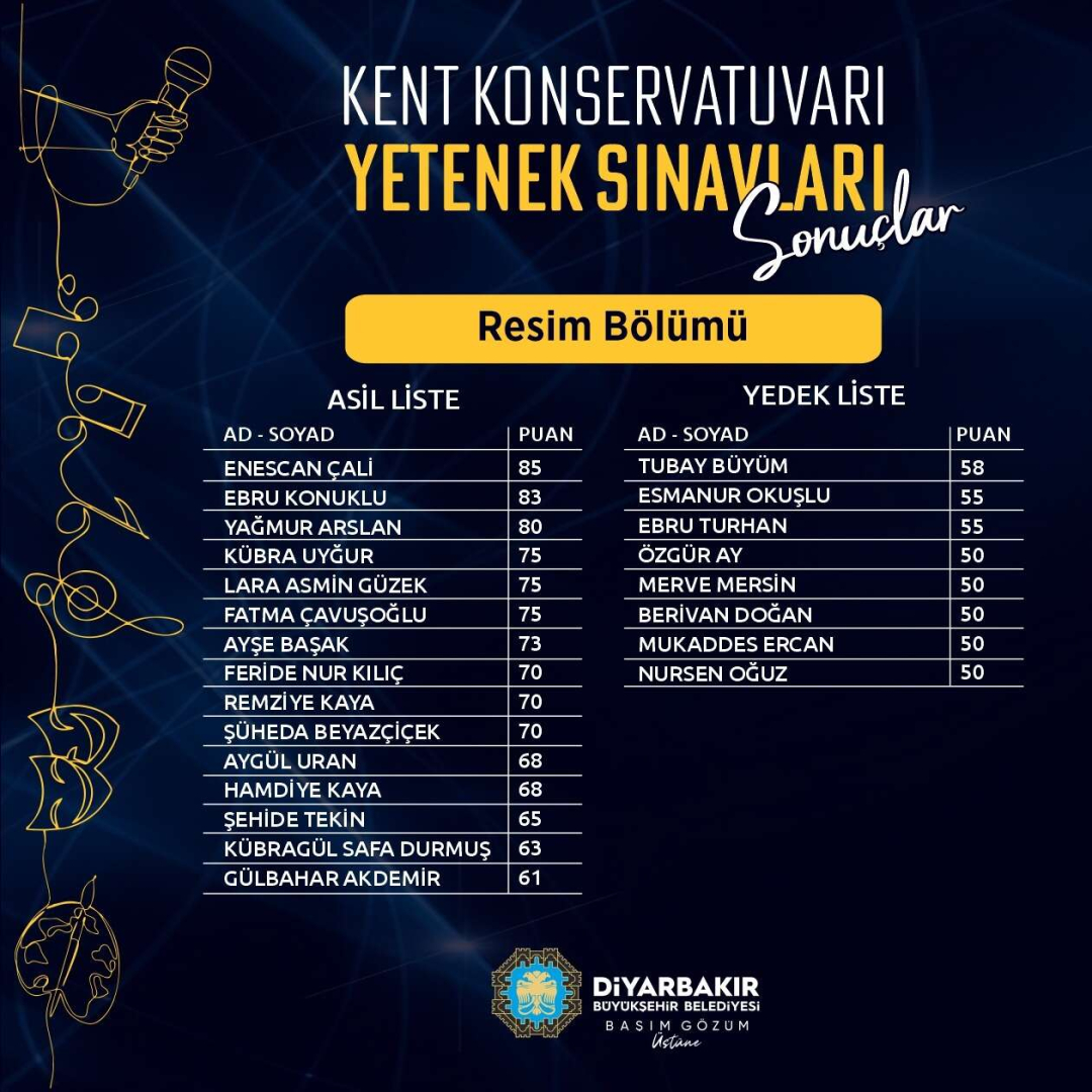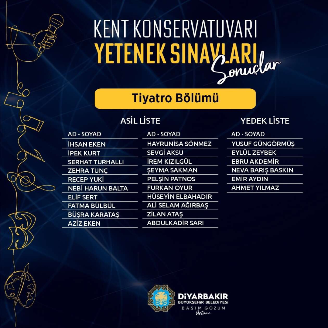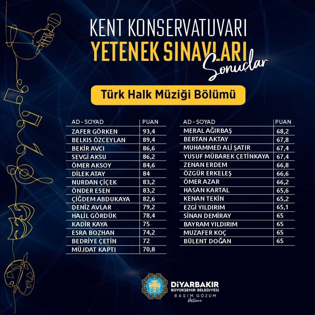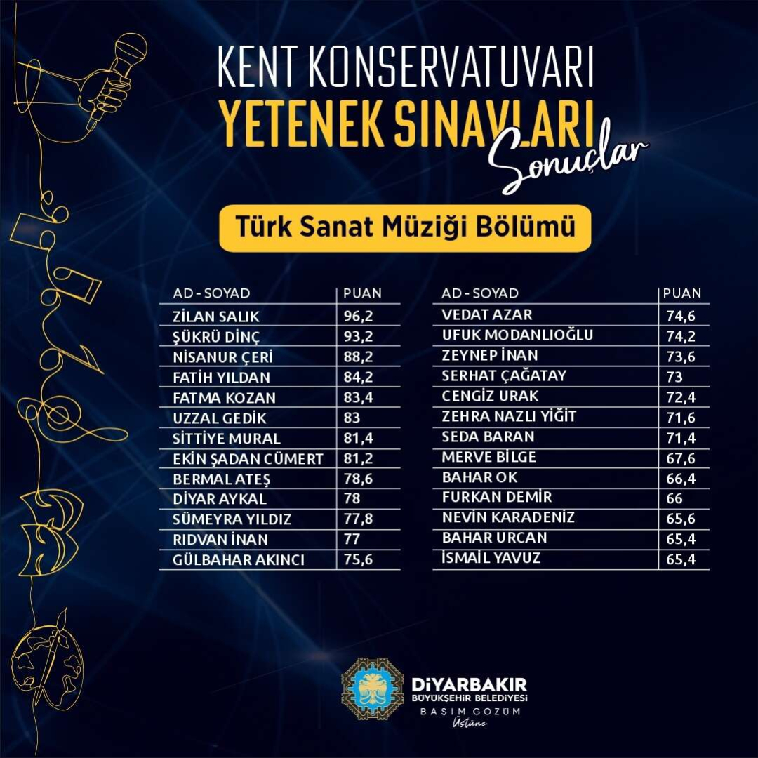 Diyarbakır Büyükşehir Belediyesi Kent Konservatuarı’na yerleşmeye hak kazanan kursiyerler belli oldu.