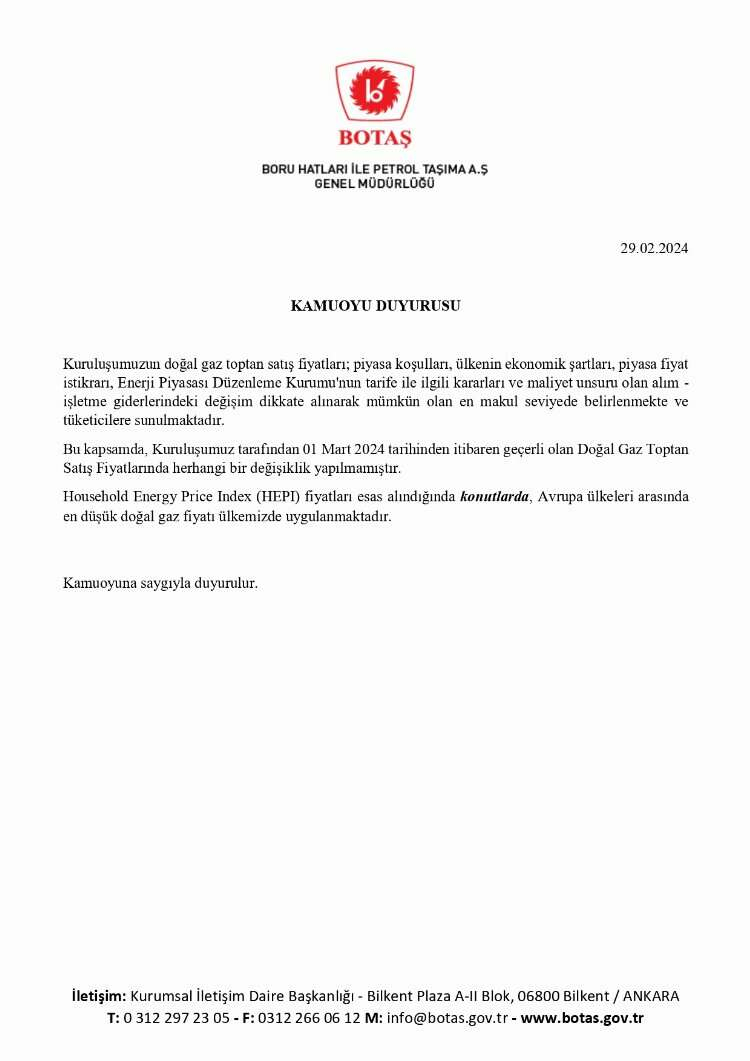 BOTAŞ, Mart ayında mesken ve sanayi abonelerinin kullandığı gazın ve elektrik üretim amaçlı gazın satış tarifesinde değişiklik yapılmadığını açıkladı.