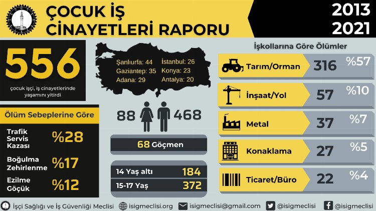 Türkiye'de son 9 yıl içerisinde ölen çocukların 316'sının tarım ve orman; 57'sinin inşaat 37'si metal; 27'sinin ise konaklama ve eğlence işkolunda hayatını kaybettiğini duyurdu.