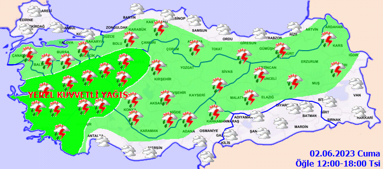 KUVVETLİ YAĞIŞ UYARISI: Gök gürültülü sağanak yağışların, Ege, İç Anadolu'nun kuzeybatısı, Kocaeli, Sakarya, Bilecik, Burdur ve Isparta çevreleri, Antalya'nın batı kesimleri ile Bursa'nın doğu ilçelerinde yerel kuvvetli olması (21-50 kg/m2) olması beklendiğinden sel, su baskını, yıldırım, yerel dolu yağışı ve yağış anında kuvvetli rüzgar gibi olumsuzluklara karşı dikkatli ve tedbirli olunması gerekmektedir.