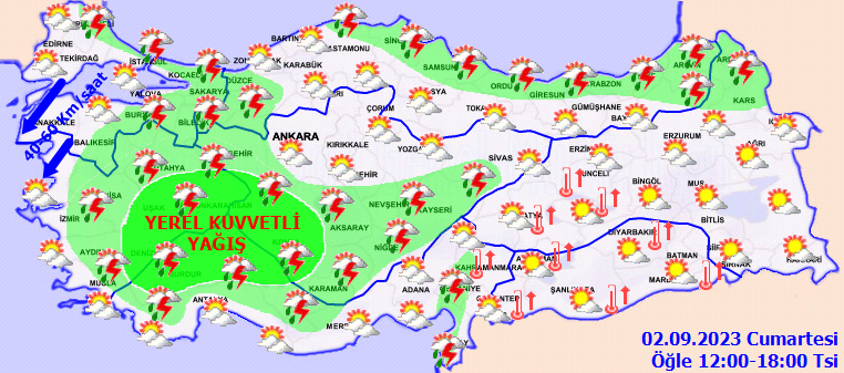 KUVVETLİ YAĞIŞ UYARISI: Yağışların; öğleden sonra İç Ege, Batı Akdeniz'in iç kesimleri ve İç Anadolu'nun güneybatısında, akşam ve gece saatlerinde Samsun ve Ordu çevrelerinde yerel kuvvetli olması (21-50 kg/m²) beklendiğinden ani, sel, su baskını, yıldırım, yerel dolu yağışı ve yağış anında kuvvetli rüzgar gibi olumsuzluklara karşı dikkatli ve tedbirli olunması gerekmektedir.