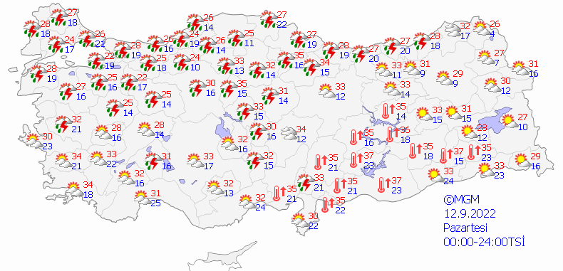 Ayrıca yine 12 Eylül saat 9.00 itibariyle Batı Karadeniz'de de Bolu, Düzce, Zonguldak, Bartın, Karabük, Çankırı, Kastamonu ve Sinop illerinde beklenen gök gürültülü sağanak yağışların yerel olarak kuvvetli olması beklendiği kaydedildi.